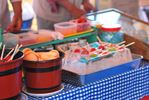 出店のあんず飴水飴、氷のベッドに乗っかっていて